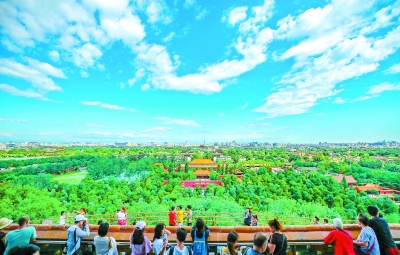 昨天,北京迎來大風天氣,藍天白云靚麗。站在景山萬春亭遠眺,空氣通透,不少市民和游客來此游覽拍照,感受美好天氣。 本報記者 武亦彬攝