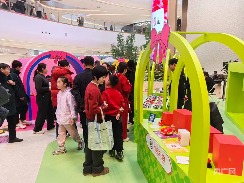 大年初二下午,“灣里·王府井WellTown”一層的懸水之境人頭攢動(dòng)。攤位被巧妙地打造成紅、黃、藍(lán)、綠、粉五組“禮盒”造型,它們簇?fù)碇鴱奶於档撵`動(dòng)水幕依次鋪開,象征著張家灣五河交匯的源遠(yuǎn)流長(zhǎng)。