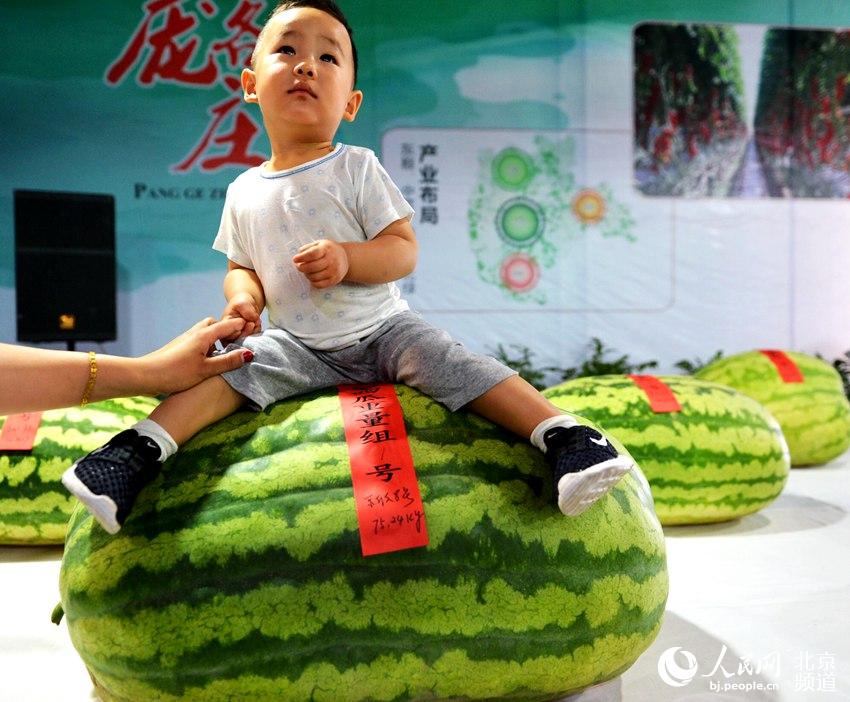 “瓜王”個頭堪比孩子。 人民網(wǎng)北京5月25日電(孟竹)“揭曉啦,75.24公斤!今年的瓜王就是它!”隨著一聲歡呼,一顆重量相當(dāng)于成年男子的西瓜“勇奪”瓜王桂冠。5月25日,一群“夏日果王”聚集在北京大興,上演了一出精彩絕倫的“宮斗”大戲——第29屆北京大興全國西甜瓜擂臺賽在龐各莊鎮(zhèn)西瓜小鎮(zhèn)舉辦,來自全國216名參賽選手帶來的上千個西甜瓜“披紅掛綠”集中亮相,接受評審們的打分,81歲瓜農(nóng)宋寶森帶來的重達150斤的西瓜在萬眾矚目重榮登“瓜王”寶座,品種為京欣8號。 記者來到西甜瓜擂臺賽現(xiàn)場,香甜清新的瓜香味道撲鼻而來。本屆西甜瓜擂臺賽設(shè)大型西瓜重量瓜王組、中型西瓜綜合組、小型西瓜綜合組、甜瓜綜合組、新品種獎、組織獎、西瓜創(chuàng)意繪畫作品組7個西甜瓜評選獎項。值得一提的是,今年的擂臺賽設(shè)立了新品種獎,參加的西甜瓜新品種達30多種,這些品種都是大興區(qū)從全國西瓜科研種業(yè)機構(gòu)引進的新品種西甜瓜。 最讓大伙兒高興的是,今年的擂臺賽引入了“互聯(lián)網(wǎng)+”新概,采取線上評選和線下活動的方式實時互動,居民也可以參與到西甜瓜的評選中。通過線上微信進行“我要上擂臺”活動,抽取出5名幸運觀眾作為今年的大眾評委!拔鞴蟿(chuàng)意作品”活動,評選出15名西瓜創(chuàng)意作品擂臺賽當(dāng)天進行展示投票,并對前三名進行表彰。線下設(shè)置游戲互動、大型主題金粉畫、西瓜大集、美食大賽等環(huán)節(jié)。 本屆擂臺賽還專門做了一套創(chuàng)新評分系統(tǒng),每位評委手持平板ipad,在對西瓜進行多方面考察的同時進行打分,打分數(shù)據(jù)將實時傳入系統(tǒng),后臺自動進行收集整理,當(dāng)評委對所有瓜品打分完畢的同時,參賽選手的得分成績也會馬上計算完畢。而在含糖量的比拼環(huán)節(jié),更增加了多臺速度更快、數(shù)據(jù)測算更加精準(zhǔn)的儀器,在保證比賽數(shù)據(jù)準(zhǔn)確的同時,也更有效的節(jié)省了現(xiàn)場打分的速度。另外,場內(nèi)設(shè)置的休息區(qū),還可以直接通過液晶屏幕滾動直播評選情況,進一步保證了比賽的公開和公正。 據(jù)龐各莊鎮(zhèn)負責(zé)人介紹,目前,全鎮(zhèn)現(xiàn)有西甜瓜種植面積3萬畝,其中設(shè)施西瓜種植面積2.3萬畝,年產(chǎn)量達1.1億公斤。今年,大興區(qū)已推廣早熟佳園、L900、亞洲蜜等西甜瓜品種1200多畝,即將上市,京城的老百姓有口福啦! -