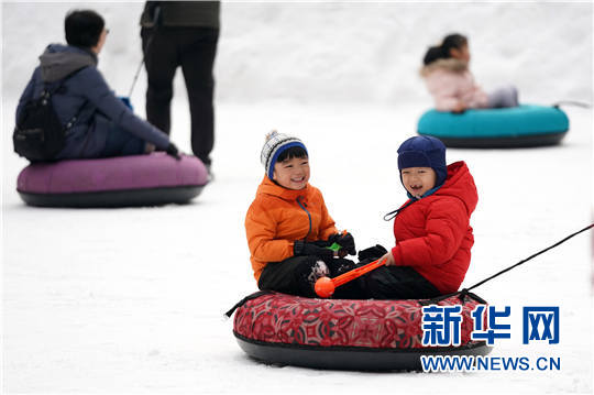 1月7日,兩位小朋友在“鳥巢”的雪圈廣場(chǎng)游玩。