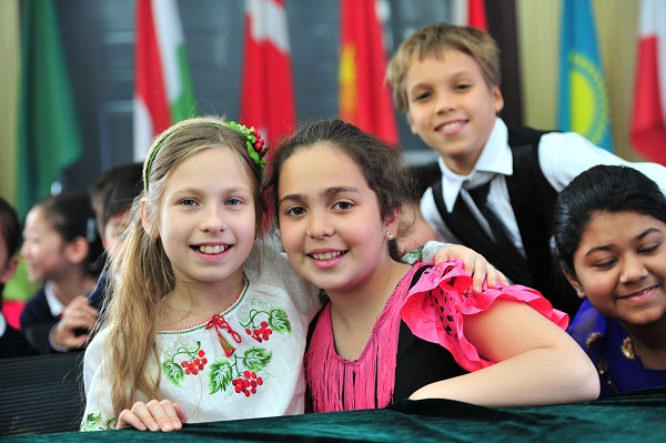 習近平總書記在2013年六一節(jié)到來之際,曾到北京少年宮看望同學們,并與在那里參加活動的芳草地的同學合影,儀式上芳草地中國部的“融之聲”合唱團唱起了《習爺爺是咱們的大朋友》,再次憶起那幸福的時光。芳草地國際部不同國籍的5名學生表演了詩朗誦《和平的色彩》,贏得一陣陣熱烈的掌聲。