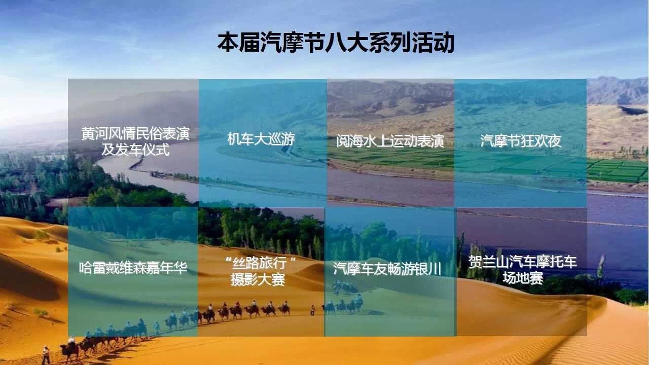 2016年8月7日至9日,首屆中國·寧夏(銀川)絲綢之路國際汽車摩托車自駕旅游節(jié)暨哈雷戴維森中國第八屆全國車主騎行活動將在寧夏回族自治區(qū)首府銀川市舉辦。據(jù)介紹,本屆汽摩節(jié)將舉辦“絲路旅行從銀川啟航”攝影大賽、黃河風情民俗展演、賀蘭山汽車摩托車場地賽、機車大巡游、水上運動表演、汽摩節(jié)狂歡夜、哈雷戴維森嘉年華、汽摩車友暢游銀川等八大系列活動,突出四大亮點: