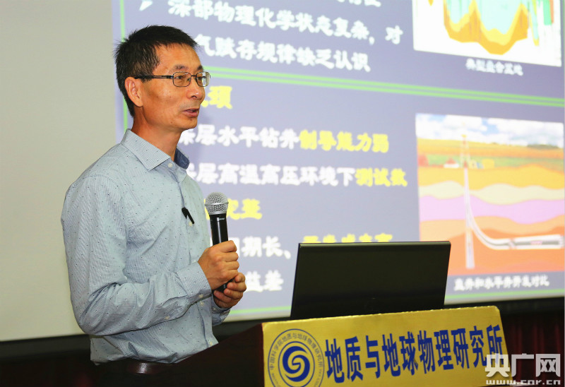中科院地質(zhì)與地球物理研究所副所長底青云介紹“智能導(dǎo)鉆”先導(dǎo)專項的組織實施(記者黃光輝攝)