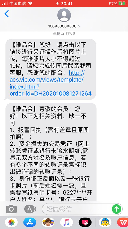 被騙后,受害者除了第一時間向警方報案外,還與唯品會聯(lián)絡(luò),質(zhì)疑其為何會把自己的隱私泄露?幾位受害人告訴記者,在他們向唯品會提交手持身份證照片等隱私數(shù)據(jù)后,唯品會向部分被騙用戶“墊付”了損失,并要求他們承諾,一旦警方破案拿到被騙款項(xiàng),返還墊付款項(xiàng)。但李女士認(rèn)為,把手持身份證照片給到唯品會,無疑又增加了一層隱私泄露的風(fēng)險。李女士說:“承諾書的話就是本人身份證號、聯(lián)系電話、地址,本人在唯品會購物后,因輕信不法分子遭遇網(wǎng)絡(luò)詐騙,本人損失為多少。本人于幾月幾日向警方報案,報警回執(zhí),現(xiàn)在唯品會從客戶體驗(yàn)角度出發(fā),預(yù)先向本人墊付,后面就是本人向唯品會承諾,如警方后續(xù)追款成功,本人將向唯品會退還警方追款成功的金額,否則唯品會有權(quán)通過法律途徑向本人予以追索全部墊付款。承諾人身份證號這些。”