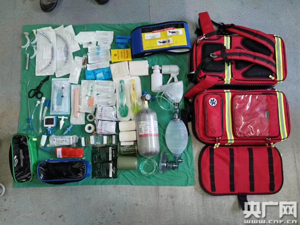李銳的急救包,內(nèi)含氧氣鋼瓶、面罩、藥品、注射器、繃帶等(央廣網(wǎng)發(fā) 受訪者供圖)
