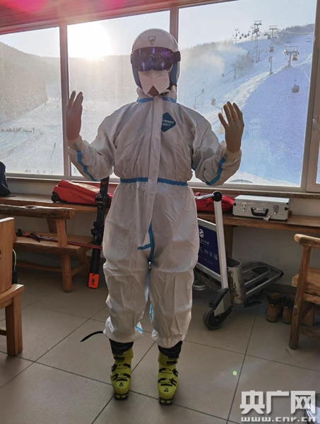 練習穿隔離服在雪道滑行(央廣網(wǎng)發(fā) 受訪者供圖)