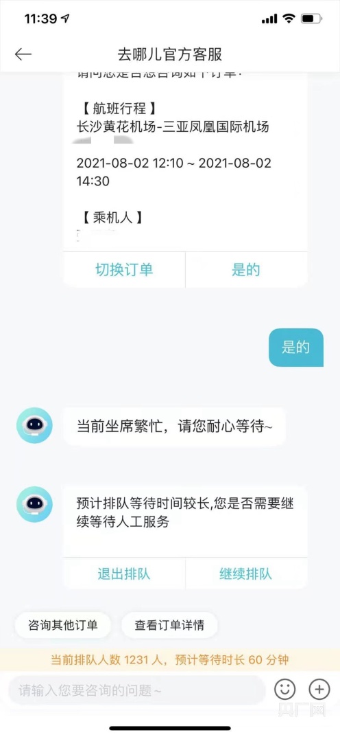 易女士說,這幾天,平臺和航空公司的客服電話很難打通,網(wǎng)絡(luò)客服排隊上千人。遇到同樣問題的還有湖南的廖女士,她是在智行機(jī)票app提交了全額退款申請,也被拒絕了:“智行軟件是晚上1:41給我們發(fā)信息說訂票不滿足全退條件,無法辦理航班的一個非自愿退票!