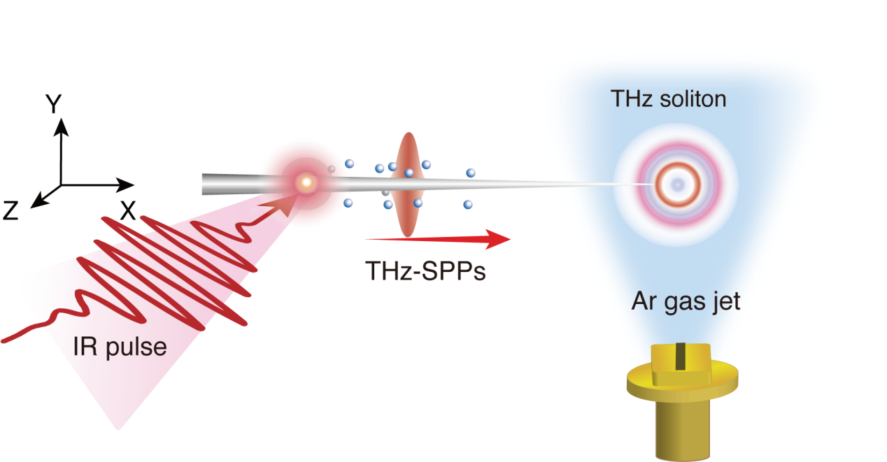 如何將電磁孤子“做大”至宏觀尺度?研究團隊跳出可見光激光路徑,轉(zhuǎn)向長波太赫茲波段。依托團隊在強激光驅(qū)動絲波導(dǎo)太赫茲源領(lǐng)域的長期積累,團隊利用納米尖端的近場增強效應(yīng),將激光驅(qū)動金屬絲產(chǎn)生的太赫茲表面波導(dǎo)引至納米級針尖,借助其亞波長約束特性(約50nm),在局域區(qū)域?qū)崿F(xiàn)了場強超過10GV/m的相對論級強度太赫茲近場,為亞毫米尺度電磁孤子的產(chǎn)生提供了高質(zhì)量的驅(qū)動源。同步引入超音速氣體噴流,將高密度氬氣注入針尖近場區(qū)。在強太赫茲場作用下,氣體被迅速電離,形成參數(shù)可控的等離子體環(huán)境。隨后電磁輻射壓推動等離子體形成一層致密的等離子體殼——如同一個無形的光之繭,將部分電磁能量囚禁在內(nèi),最終形成一個直徑約400微米、壽命長達百納秒的發(fā)光球,遠超普通熱等離子體的存在時間。實驗中,這個“能量球”緩慢膨脹,發(fā)出的光譜覆蓋從紫外到紅外的寬波段,完全符合理論預(yù)言的“電磁孤子”行為。經(jīng)物理標(biāo)度變換,該孤子可對應(yīng)自然界中直徑幾十厘米、持續(xù)數(shù)秒的“球狀閃電”。