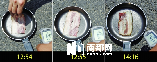 昨天(30日)正午的街頭,真有人拿著平底鍋,鍋里放上香腸、培根,或者五花肉,在馬路上做起了高溫實驗。比如在上海人民廣場,上海電視臺記者把一塊五花肉直接放在大理石地面上,30秒后貼地的一面已經(jīng)泛起了白,10分鐘后八分熟的五花肉向外飄香。