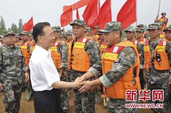 7月24日,中共中央政治局常委、國務(wù)院總理溫家寶在安徽檢查指導(dǎo)淮河防汛抗洪工作。這是在淮河大堤旁的防汛石料儲(chǔ)備點(diǎn),溫家寶慰問在抗洪第一線的解放軍、武警和民兵預(yù)備役官兵。 新華社記者 黃敬文 攝