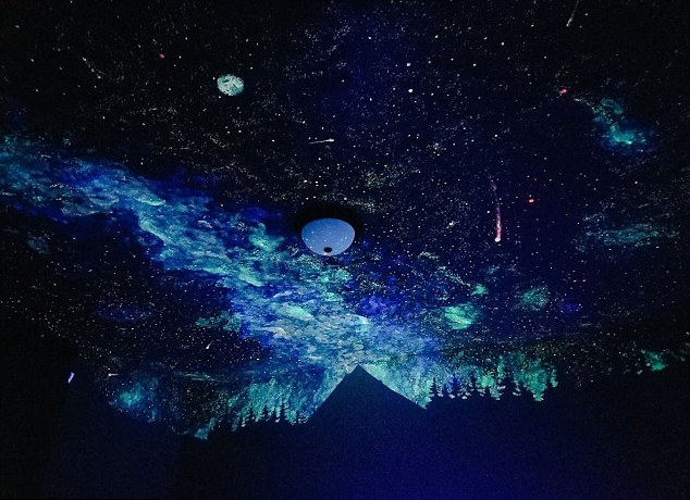 克里斯平說:“繪制墻面的油漆在白天看不見,只能在黑暗中發(fā)光,所以我只能在微暗的房間里,踩在結(jié)實的梯子上伴著音樂繪畫!彼做了針葉林模板,用藍色膠帶貼在天花板下方。當(dāng)燈光熄滅的時候,一抬頭就能看見璀璨的星空。