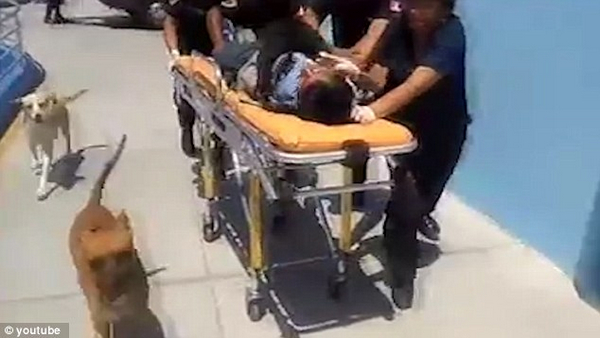 醫(yī)院安保錄像顯示,該男子在等待接受治療時(shí),其中一只寵物狗跳上了擔(dān)架床,陪昏迷男子一起躺著;另一只寵物狗則坐在擔(dān)架床邊,目不轉(zhuǎn)睛地守護(hù)著。最后,該昏迷男子被送去接受治療,而兩只寵物狗仍絲毫不放松,靜候一旁。