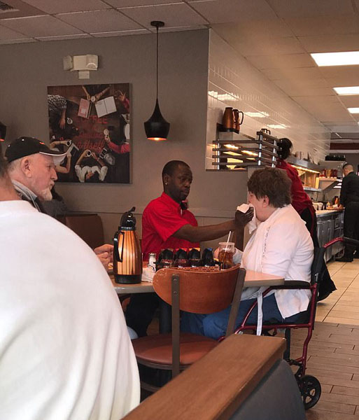 如今,搞怪或嘩眾取寵的圖片視頻充斥網(wǎng)絡(luò),但這并非網(wǎng)絡(luò)世界的主流,很多暖心的生活片段也會(huì)在這里精彩綻放。近日,來自美國伊利諾伊州斯普林菲爾德的43歲早餐店店員喬?托馬斯幫助店內(nèi)殘疾女顧客進(jìn)食的照片走紅“臉譜”網(wǎng),網(wǎng)友紛紛為心地善良、樂于助人的托馬斯點(diǎn)贊。