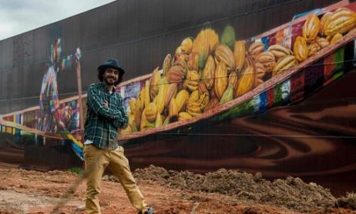 此次的壁畫,科布拉以巧克力的原材料可可為題材。畫中,一名男子在“巧克力河”上劃著小船,船上滿載著可可果實(shí)。