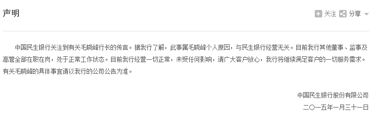 業(yè)內(nèi)普遍認為,民生銀行發(fā)布公告對此事進行回應(yīng)已經(jīng)從側(cè)面證實此前毛曉峰的相關(guān)傳言。
