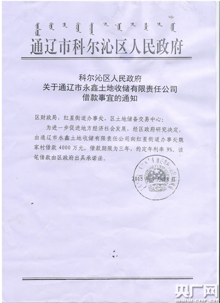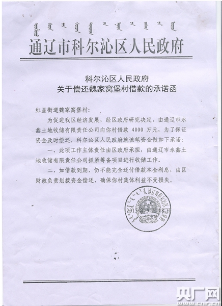 魏家窩堡村書記朱玉國告訴記者,借貸風險可控,因為有當?shù)卣膿!?jù)村民們提供的《科爾沁區(qū)人民政府關(guān)于償還魏家窩堡村借款的承諾函》記載:“為促進我區(qū)經(jīng)濟發(fā)展,經(jīng)區(qū)政府研究決定,由通遼市永鑫土地收儲有限責任公司向你村借款4000萬元,為了保證資金及時償還,科爾沁區(qū)人民政府就該筆資金作如下承諾:一、此項工作主體責任由政府承擔,由通遼市永鑫土地收儲有限責任公司抓緊籌備項目進行收儲工作。二、如借款到期,仍不能完全還付借款本金利息,由區(qū)財政負責劃撥資金償還,確保你村集體利益不受損失。”