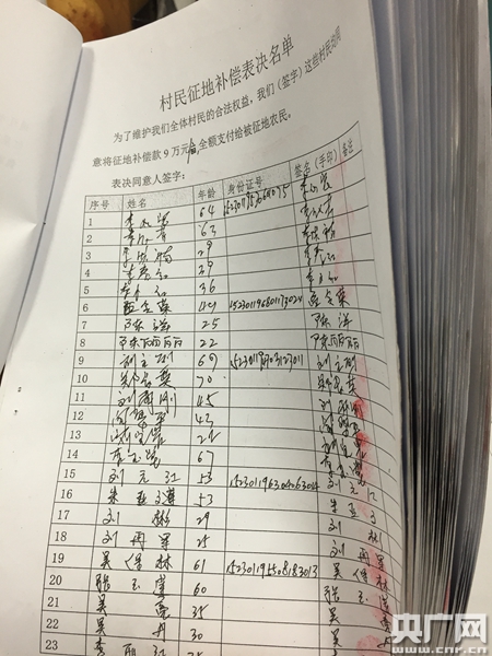 至今,對于這樣的分配方式,當?shù)卮迕袢圆荒芙邮堋2稍L中,他們還向記者提供了一份《要求全額支付征地補償費申請書》,《申請書》中寫道:“經(jīng)過征求全體1410名有選舉權(quán)的其中960名村民意見(已經(jīng)超過全體村民三分之二),960名有選舉權(quán)的村民全部同意:由于沒有對征地農(nóng)民進行安置,將每畝地9萬元征地補償款全額支付被征地農(nóng)民!备巾撝惺960名村民的征地補償表決名單,共計44頁。