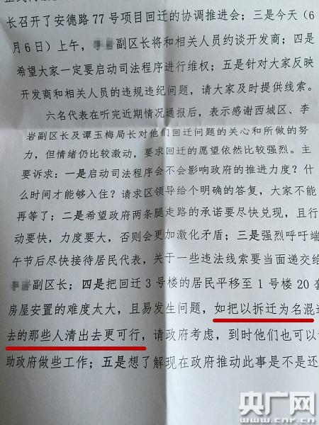 6月6號(hào),西城區(qū)房管局應(yīng)急與信訪科給上級(jí)單位的一份接待77號(hào)院居民代表的情況中寫道:“把回遷3號(hào)樓的居民平移至1號(hào)樓20套房屋安置的難度太大,且易發(fā)生問(wèn)題,如把以拆遷為名混進(jìn)去的那些人請(qǐng)出去更可行,請(qǐng)政府考慮”,并建議回遷戶啟動(dòng)司法程序維權(quán)。