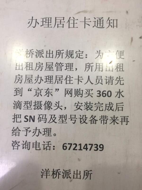 薛女士提供的現(xiàn)場照片上,可以看到一份名為“辦理居住卡通知”。其中這樣表述:洋橋派出所規(guī)定,為方便出租房屋管理,所用(有)出租房屋辦理居住卡人員請先到京東網(wǎng)購360水滴型攝像頭,安裝完成后,把SN碼及型號設(shè)備帶來,再給予辦理。后面所附的咨詢電話,正是洋橋派出所的辦公電話。