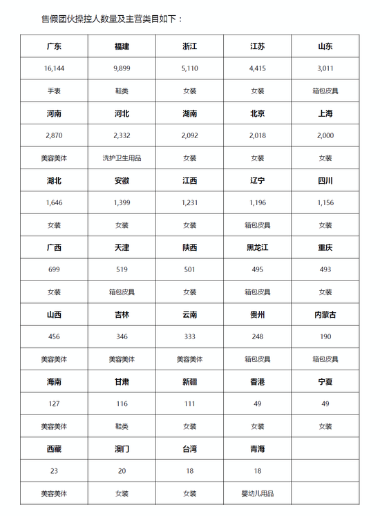 阿里巴巴集團(tuán)首席平臺(tái)治理官鄭俊芳表示,地圖展示了假貨控制團(tuán)伙的分布,有明顯的地域性及產(chǎn)業(yè)集群性!拔覀兛吹讲煌念伾,橙色是美容美體類目的,藍(lán)色是女裝類目的。比如在廣東,它是1萬(wàn)多,其中手表更多。其次在浙江、江蘇,以女裝為主。在福建主要是以鞋類為主。