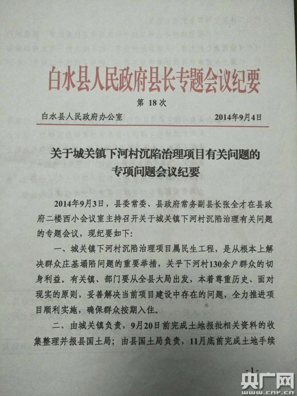 2014年9月4日,時任白水縣常務副縣長的張全才召開專題會議,研究下河村沉陷治理項目的有關問題,并對相關工作的進展提出時間表。但三年多過去了,下河村村民仍沒有得到安置。