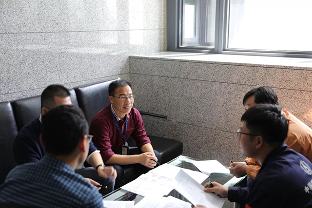 張志廣(中)就產(chǎn)品設(shè)計與總裝師傅進(jìn)行溝通
