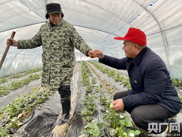楊長太在草莓大棚和貧困戶在一起(中央廣播電視總臺央廣記者 胡曉輝 攝)