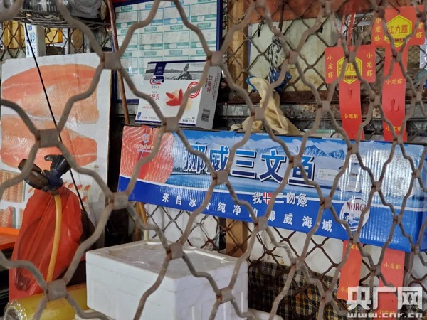 北京大洋路海鮮市場內(nèi),三文魚攤位接到通知關(guān)閉(中央廣播電視總臺央廣記者 任夢巖 攝)