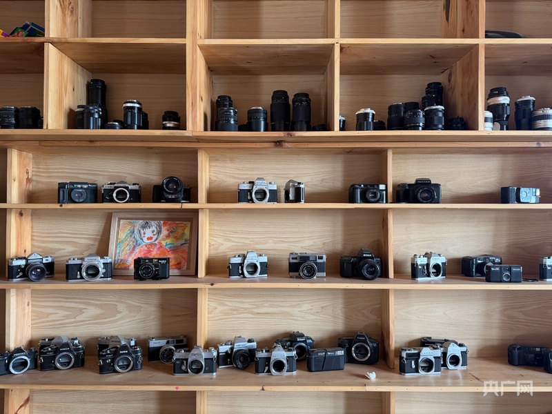 店內(nèi)布置簡約而用心,中央置物架上擺放著復(fù)古玩偶、寶麗來相機與膠卷盒,臺面上整齊陳列著各類膠片相機;另一側(cè)墻面的置物架上,還有數(shù)十臺膠片相機與鏡頭,成為店內(nèi)獨具特色的影像展示空間。阿龍說,春節(jié)期間訂單不斷增多,他們把生活的頻率調(diào)得更快了些,但洗膠片的慢節(jié)奏才是小店的主旋律,忙碌與從容一點都不違和。
