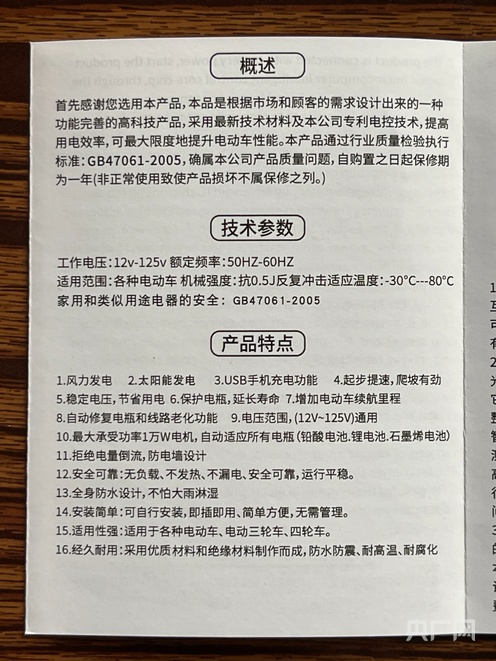 產(chǎn)品說(shuō)明書(shū)的技術(shù)參數(shù)一欄顯示的工作電壓是12V到125V,適用范圍是各種電動(dòng)車,還特意標(biāo)明產(chǎn)品符合GB47061-2005也就是家用和類似用途電器的安全通用要求,甚至羅列出包括USB手機(jī)充電、穩(wěn)定電壓、保護(hù)電瓶、安全可靠等16項(xiàng)產(chǎn)品特點(diǎn)。
