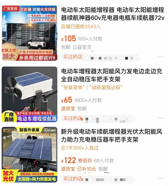 另一家維修點(diǎn)的師傅說(shuō),目前只有外接充電寶和燃油增程器有效果,利用“太陽(yáng)能+風(fēng)能”發(fā)電的產(chǎn)品效果甚微。