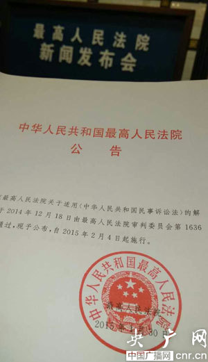 央廣網(wǎng)北京2月4日消息(記者孫瑩)據(jù)中國之聲《央廣新聞》報道,新修改的《民訴法》2013年1月1日起施行,修改條文近100處,是我國民主法制建設(shè)的重大立法成果。最高人民法院今天(4日)上午正式發(fā)布新的《關(guān)于適用<中華人民共和國民事訴訟法>的解釋》,對法院適用民事訴訟法的相關(guān)問題作了全面系統(tǒng)、明確具體的規(guī)定。最高法召開新聞發(fā)布會,對這部司法解釋進行解讀。