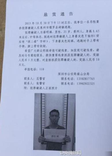根據(jù)深圳市公安局南山分局的通報(bào),30號(hào)下午,犯罪嫌疑人被深圳警方帶到博羅縣指認(rèn)丟棄作案工具現(xiàn)場(chǎng)的時(shí)候,趁機(jī)跳車逃入山里面。警方對(duì)這名犯罪嫌疑人的描述是,男性,21歲,貴州人,身高1.65米,中等體態(tài),逃脫時(shí)身穿灰色T恤和灰色長(zhǎng)褲,背后印有“深二看”三個(gè)字。