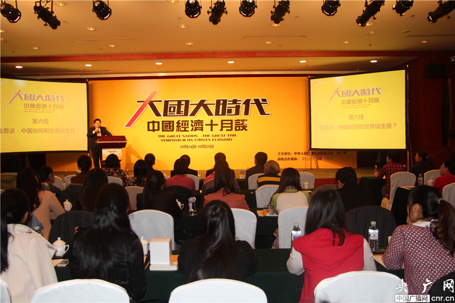 10月21日,由中央人民廣播電臺經(jīng)濟(jì)之聲、央廣網(wǎng)主辦的《大國大時代----中國經(jīng)濟(jì)十月談》系列時事報告會之六“生意談”,在廣電國際酒店舉行。今天的主題是《生意談:中國如何和世界談生意?》。圖為報告會現(xiàn)場(央廣網(wǎng) 李靜/攝)