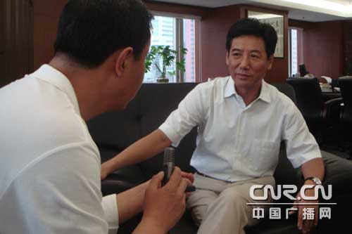 圖為中央臺(tái)記者張四清采訪大連銀行行長王勁平