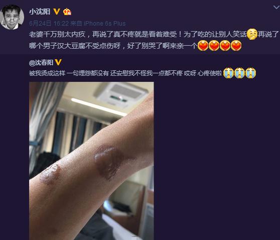 6月24日,沈春陽在微博中發(fā)布了一張被燙傷手臂的照片,“被我燙成這樣,一句埋怨都沒有,還安慰我不怪我一點(diǎn)都不疼。哎呀!心疼死啦!”