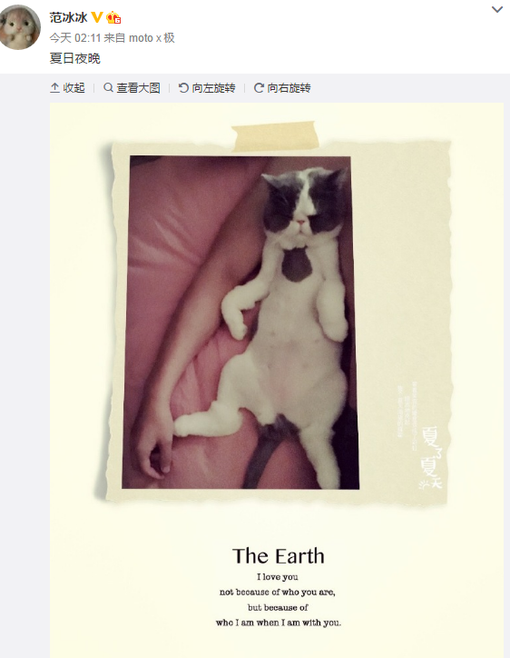 范冰冰半夜曬李晨“裸睡”照 活生生的人不如喵