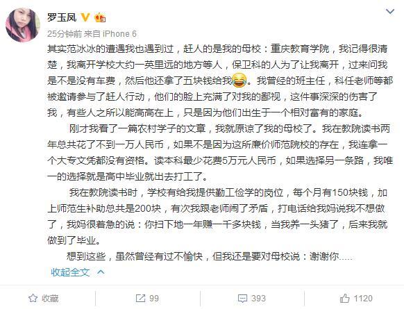 近日,范冰冰因去高校宣傳電影不足十分鐘離場引起關(guān)注。27日,鳳姐羅玉鳳也在微博談起此事,表示也曾經(jīng)歷過相同的事情。