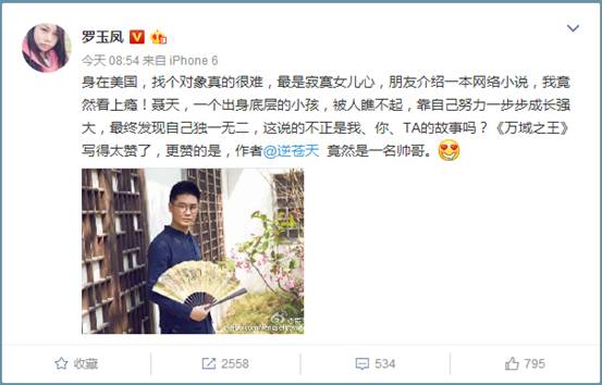 《萬(wàn)域之王》講述了出身底層宗族的小人物“聶天”從小被輕視、被欺凌,后靠自己的天賦與努力歷盡艱險(xiǎn)一步步成長(zhǎng)為“碎星古殿傳承人”并向隕星之地“萬(wàn)域之王”進(jìn)發(fā)的傳奇故事。因?yàn)檎芰颗c小人物的奮斗,讓許多粉絲與聶天產(chǎn)生共鳴,進(jìn)而深深熱愛(ài)上《萬(wàn)域之王》。鳳姐作為小人物奮斗的代表典型,或是從男主身上看到自己的影子,而喜歡上該書(shū)。無(wú)論如何網(wǎng)絡(luò)文學(xué)影響力正在逐漸擴(kuò)大,未來(lái)還將會(huì)有更多的明星粉絲出現(xiàn)。