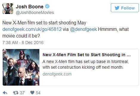 來(lái)自《蒙特利爾日?qǐng)?bào)》的一篇報(bào)道透露,福斯已經(jīng)租用了位于蒙特利爾的MELS攝影棚,明年一月攝影棚就將開始搭景。MELS攝影棚總裁米歇爾·特魯?shù)聽枺∕ichel Trudel)也確認(rèn)了這一消息:“他們將于明年五月正式開拍,將占用MELS的二號(hào)和三號(hào)攝影棚,拍攝工作將持續(xù)數(shù)個(gè)月!边@篇報(bào)道并沒有指明明年五月開拍的是哪部《X戰(zhàn)警》電影,然而《新變種人》導(dǎo)演喬什·波恩(Josh Boone)之后轉(zhuǎn)發(fā)了這一消息,同時(shí)還耐人尋味的問(wèn)了一句:“到底會(huì)是哪部《X戰(zhàn)警》電影呢?”波恩轉(zhuǎn)發(fā)這條新聞無(wú)疑是“不打自招”,從之前外媒的報(bào)道來(lái)看,福斯能夠在半年后開拍估計(jì)也就只有《新變種人》了。