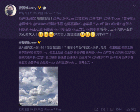 不料隨后@曹晏維Jerry再次發(fā)微博表示:“三年間原來合作了這么多藝人,好希望大家都能來!”又附上一份長長的明星大咖名單。網友只能表示:“走過最深的路,就是你的套路”。看來2016酷狗直播繁星音樂盛典的明星出席名單仍然深埋在一片迷霧中,不過無論如何,@曹晏維Jerry都為大家劃定大致范圍了,至于究竟有誰?粉絲們還是乖乖等官方消息吧~