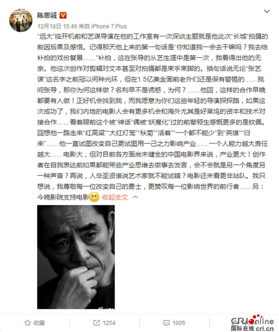 張藝謀新作《長城》已于12月16日在國內(nèi)公映,首周末三天狂攬4.7億票房,單片帶動中國電影市場同比增長3成,同時僅憑國內(nèi)票房就在全球票房榜上排名第二,僅次于海外54個市場率先上映的《星球大戰(zhàn)外傳:俠盜一號》,截至19日19時,影片4天不到票房已突破5億。而與市場上的鯨吞之勢形成鮮明對比的,是電影在影評界的“被圍攻”處境,甚至有影評人喊出了“張藝謀已死”的言論,引出電影出品方之一不滿,直接附上聲明要求刪除。近日,“長城論戰(zhàn)”再度升級,驚動了多位導演,陸川、陳思誠、讓·雅克·阿諾幾位知名導演從各個渠道表態(tài)支持張藝謀。