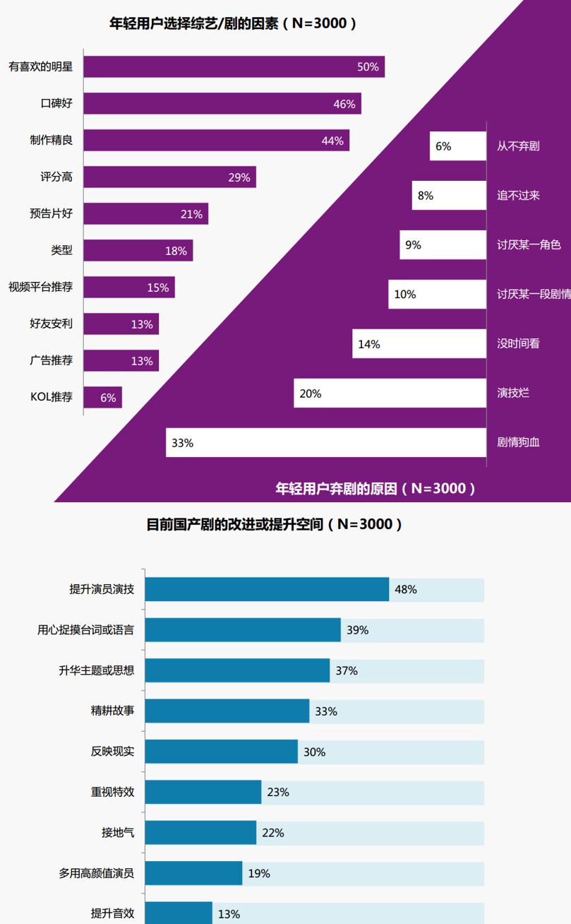 比較出乎意料的是,素以“顏控”來標榜自己的年輕用戶,對好劇的評判標準,早已不停留于“顏值即正義”,變得相當挑剔。報告顯示,雖然明星依然是年輕用戶選劇的重要參考因素,但狗血劇情和“感人”演技卻是用戶的第一棄劇理由。作為看著美劇、吃著漢堡長大的一代,年輕用戶對網(wǎng)絡(luò)劇和網(wǎng)絡(luò)綜藝的鑒賞能力同步提升,單純依靠卡司、高顏值、“粉絲濾鏡”來制造爆款的粗暴邏輯已不適用于當下。