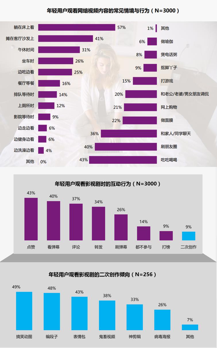 隨著劇綜類型的豐富、觀劇方式的多元化,觀看視頻在今天不僅是單純的娛樂手段,而成為年輕人生活的一種方式。尤其懶懶的癱在床上和沙發(fā)上看劇,是年輕人最愛的觀劇姿勢。同時,數(shù)據(jù)顯示,100%的年輕人在看劇的同時,會附帶其他娛樂,其中吃吃喝喝、刷盆友圈是追劇最佳伴侶。