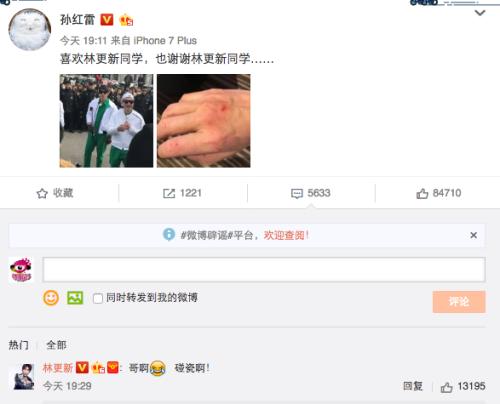 日前,孫紅雷分享了和林更新一起錄制《極限挑戰(zhàn)》的照片,并一同曬出自己擦傷明顯、多處流血的右手,配文稱:“喜歡林更新同學(xué),也謝謝林更新同學(xué)……”林更新隨后轉(zhuǎn)發(fā)并回復(fù)孫紅雷,“哥啊,碰瓷!”圖片中,孫紅雷與林更新正在錄制中,孫紅雷舉起右手指點(diǎn)傷疤,嬉笑著和面前的人解釋,林更新位于他身后,看不出表情。
