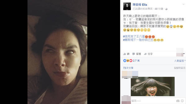 Ella睡前習(xí)慣和老公談天,她表示看完勁寶超聲波照片,直呼跟老公小時(shí)后長(zhǎng)的相當(dāng)神似,便嬌羞跟老公預(yù)約要生第二胎,而且還是要生個(gè)長(zhǎng)得很像的女兒,未料老公竟回“那不就會(huì)很像男的”,這讓Ella瞬間大動(dòng)肝火,不僅大罵老公“王八蛋”,還指名道姓要他下胎自己生,對(duì)此粉絲直呼夫妻間的對(duì)話好可愛,根本就是在放閃。