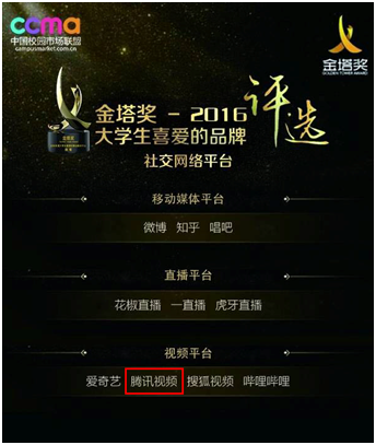 2017中國校園市場年度峰會暨金塔獎是在中國青少年新媒體協(xié)會和全國學(xué)校共青團新媒體運營中心的指導(dǎo)下,由中國校園市場聯(lián)盟等組織和企業(yè)聯(lián)合協(xié)辦的校園市場行業(yè)最權(quán)威的獎項。此次頒獎典禮上,騰訊視頻喜獲“2016年度大學(xué)生喜愛的視頻平臺”榮譽,當(dāng)之無愧地成為當(dāng)代大學(xué)生認(rèn)同又認(rèn)可的內(nèi)容平臺,也是影響年輕群體核心價值觀的重要渠道。