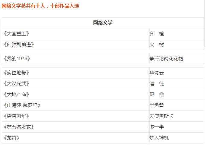 據(jù)中國作協(xié)官方公布的信息,2017年度重點作品扶持工作收到申報選題377項,經(jīng)專家論證和中國作家協(xié)會書記處審核,確定76項選題入選:長篇小說30項,報告文學(xué)、紀(jì)實文學(xué)20項,詩歌3項,散文7項,兒童文學(xué)4項,網(wǎng)絡(luò)文學(xué)10項。通過公布的重點作品名單可以看到,在網(wǎng)絡(luò)文學(xué)作品的創(chuàng)作選題評估上,注重支持反應(yīng)現(xiàn)實生活、弘揚中國精神,書寫中國民族偉大復(fù)興中國的選題內(nèi)容。而更俗的《大地產(chǎn)商》則是一部以房地產(chǎn)行業(yè)為背景的商業(yè)勵志作品,而酒徒的《大漢光武》則是一部再現(xiàn)漢朝光輝歷史的鴻篇巨制。