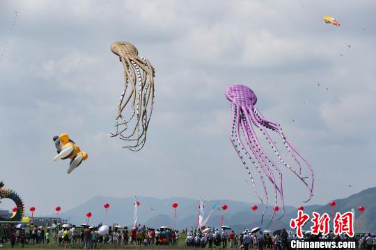 中新網(wǎng)貴州興仁9月27日電 (記者 劉鵬)巨型軟體八爪魚、巨型毛毛蟲、顏色鮮艷的滾地龍、夜光風(fēng)箏……27日,來自全國(guó)各地的30余支風(fēng)箏隊(duì)伍帶來了300余只鮮艷奪目、形狀各異以及獨(dú)具地方特色的風(fēng)箏在貴州省興仁縣上演精彩的藍(lán)天派對(duì),共同歡慶當(dāng)?shù)亍鞍嗽掳恕泵缱屣L(fēng)情節(jié)。