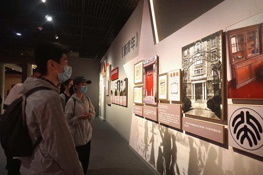 特展展廳里,北大車協(xié)的同學(xué)們駐足在一張北大紅樓的歷史照片前,久久端詳不愿離開(kāi)——這座建筑當(dāng)年是新文化運(yùn)動(dòng)的大本營(yíng),亦是紅色中國(guó)的起點(diǎn)。